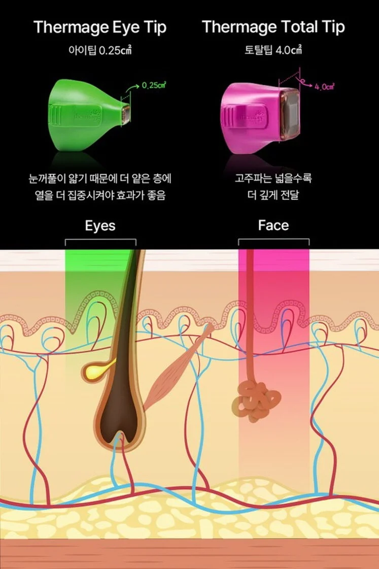 Lão hóa vùng mắt thường ảnh hưởng đến ấn tượng tổng thể khuôn mặt. Eye Thermage sử dụng đầu tip nhỏ hơn và chính xác hơn so với Thermage thông thường, phù hợp với da mỏng quanh mắt.